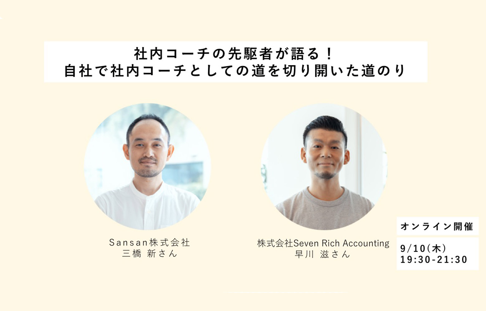 社内コーチ向けのイベントとしては第2回目となる今回は、社内コーチの先駆者であるSansan株式会社三橋新さんと、株式会社Seven Rich Accounting早川滋さんをゲストにお招きし、自社内で社内コーチとして切り拓いた道のりについてお話しいただきました。モデレーターは、株式会社ガイアックスの社内コーチである荒井智子が担当しました。なお、本記事は同じく社内コーチである樗木亜子が執筆します。