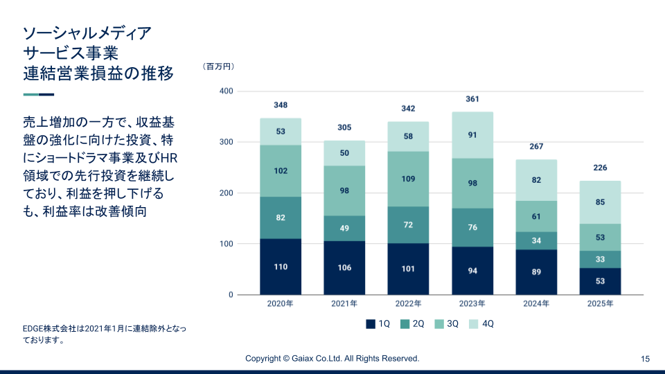 しかし、直近においては、今後の収益基盤強化に向けた新規事業(ショートドラマ事業における自社IPの番組制作や広告宣伝、HR領域における専門人材の獲得など)への積極的な先行投資を実施したため、販管費が膨らみ、一時的に利益率が落ち込む(あるいは赤字となる)期間がありました。その後、売上の拡大に伴ってこれらの先行投資が順次回収され始め、子会社CREAVEとの組織体制の再構築等も進んだ結果、2025年度の第4四半期に向けて利益状況は大幅に回復・改善しています。
