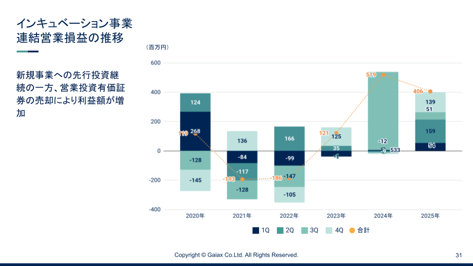 キャピタルゲインがある年とない年で業績が上下動することはありますが、事業全体を伸ばすことで右肩上がりの成長を目指しています。