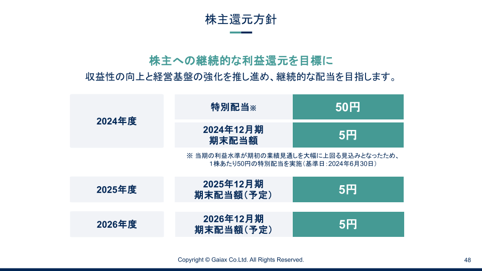 今後は、ショートドラマ制作などの知見を活かした他社との共同事業化等で利益率の低下を防ぎつつ、先行投資の回収と事業の拡大を通じて、継続的に利益を増加させていく計画となっています。