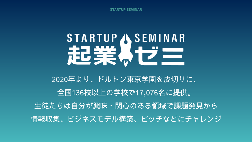 また、「起業ゼミ」というのは、中学校や高校の授業に我々の社員が赴いて、学生の皆さんに「起業していくためにはこういう心構えが必要ですよ」といったお話をさせていただいているものです。こちらも本当に多くの自治体さんからお話をいただいており、今どんどん規模が増えているところです。