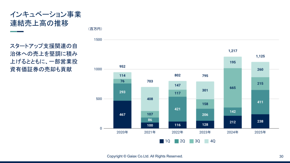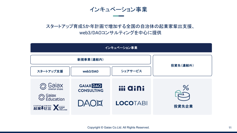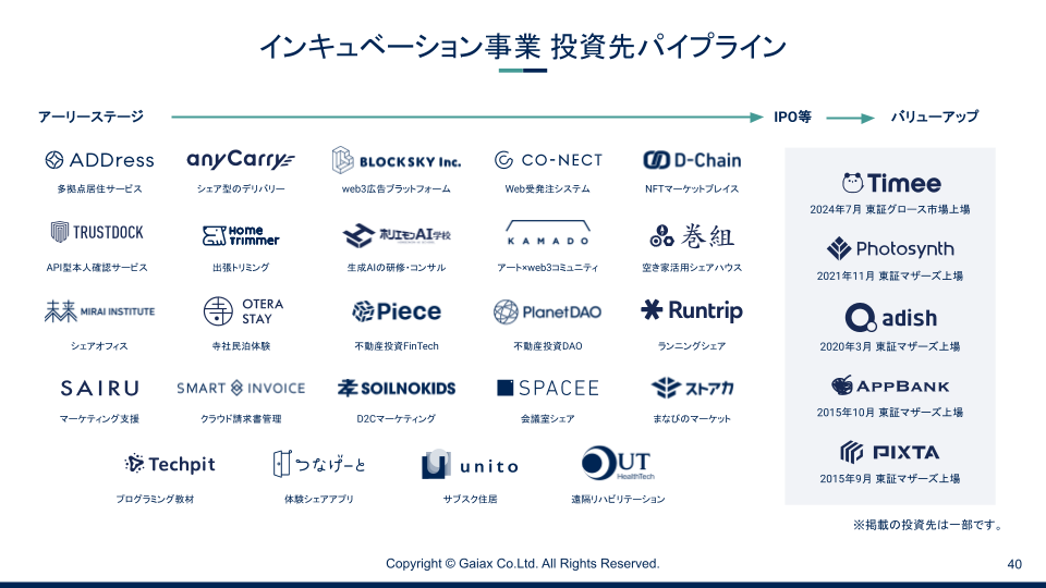 自治体さんからも「いい会社があれば、遠慮していただく必要はありません。ガイアックスが自腹で投資する分にはどんどん投資してください」とおっしゃっていただいており、我々もいい会社になるように頑張って育てて、いい会社に投資をしています。自治体さんからいただくお金は我々の大切な事業の収益ですが、その中で良い会社に投資をしてキャピタルゲインを上げるというのも、1つの重要な事業だと思ってやっています。