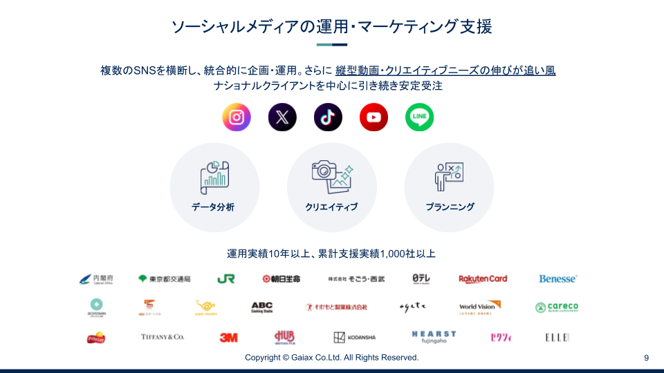 上田: 創業以来10年以上にわたり、1,000社以上の企業様をご支援してきた実績がございます。各種SNSを横断的に支援でき、かつデータ分析からプランニングまで統合的にサービスを提供できることが強みです。