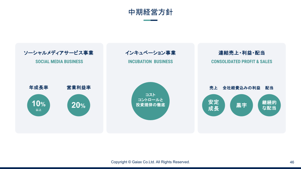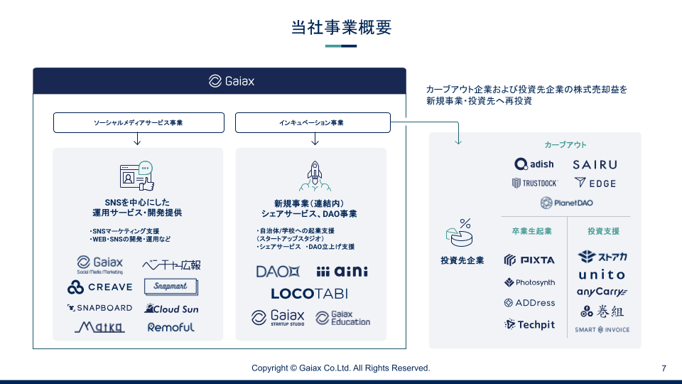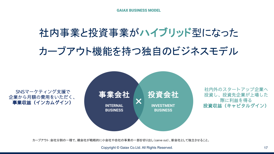 上田:はい、当社は事業会社と投資会社のハイブリッドモデルです。ソーシャルメディアサービス事業でインカムゲインによる安定成長を図りつつ、インキュベーション事業において新規事業の創出、場合によっては事業をカーブアウト(外部資金を入れて独立)し、投資先が上場等をした際に得られるキャピタルゲインの両方を狙っています。