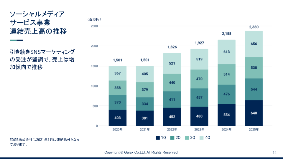 上田:ソーシャルメディアサービス事業の売上は、SNSマーケティング支援などの受注が堅調に推移し、増加傾向で順調に成長しています。直近の2025年12月期における同セグメントの売上規模は23億8000万円となりました。