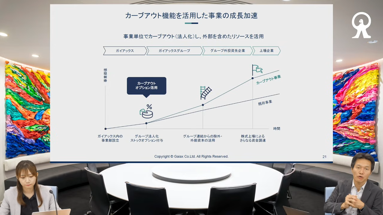 Q: 起業家輩出、カーブアウトが特徴ですが、そのメリットは?株式比率が下がるのはデメリットではないですか?