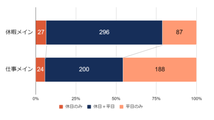 そこで本調査では「休暇メイン」「仕事メイン」について、誰と行くか、曜日、予算、宿泊施設に求める設備・環境を比較し、ニーズを明らかにします。